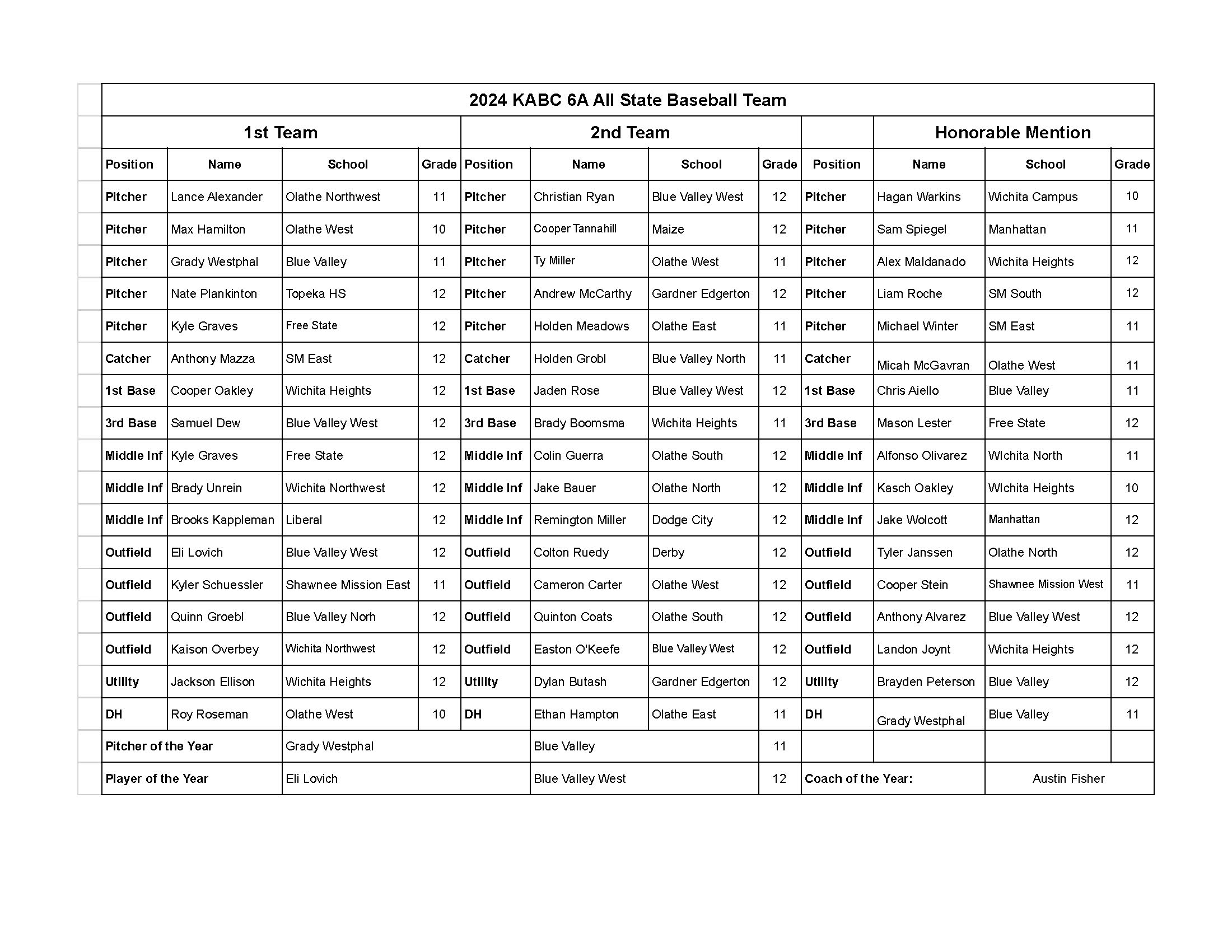 Clockwise from top left: Liberal's J. Brooks Kappelmann, Hesston's Whit Rhodes, Humboldt's Sam Hull, Ellsworth's Lane Rolfs, Abilene's Stocton Timbrook and Atchison's Jeter Purdy were among the Kansas Association of Baseball Coaches 2024 All-State selections. (Photos: Heather Kindall Photography)
