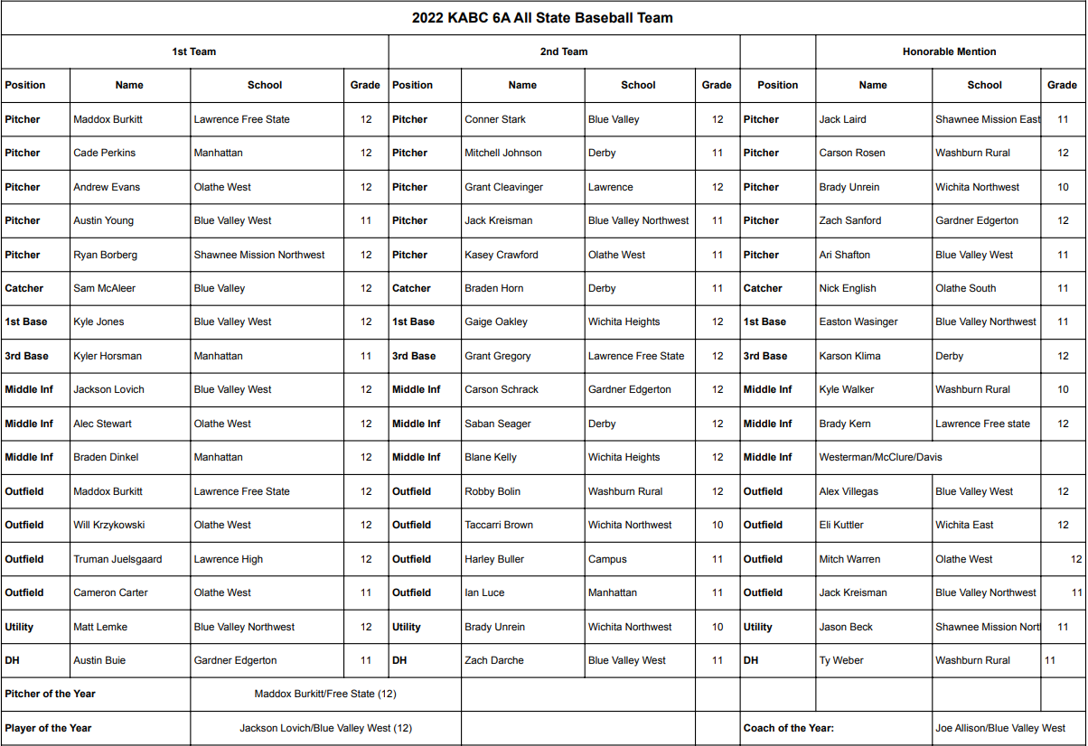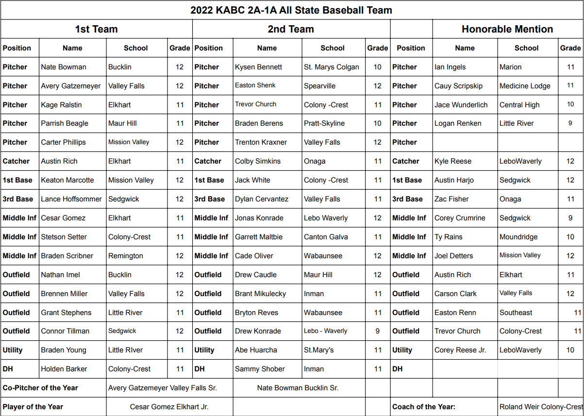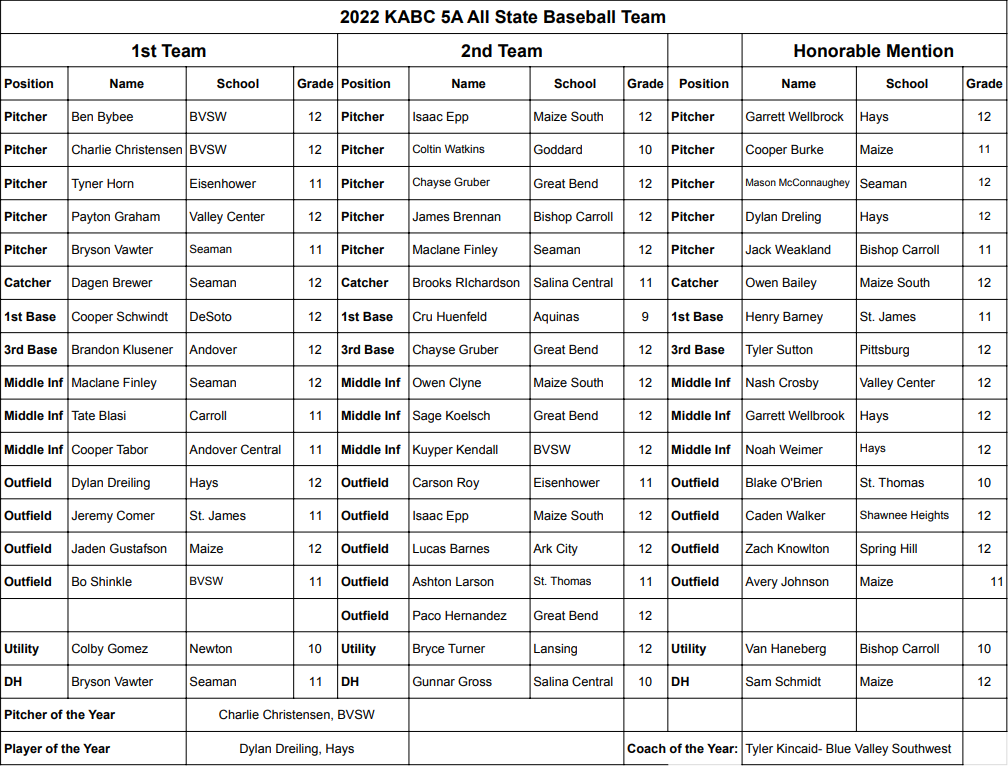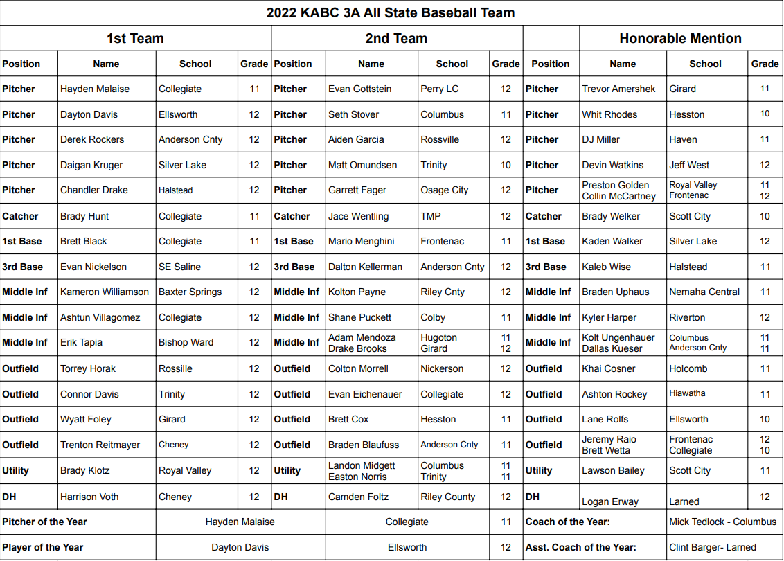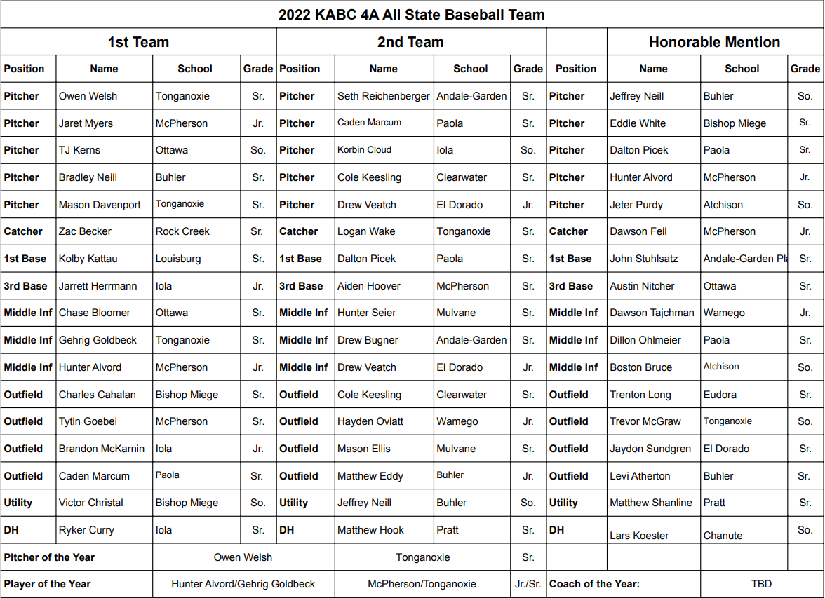 The Kansas Association of Baseball Coaches recently released their All-State teams. Check them out below:
