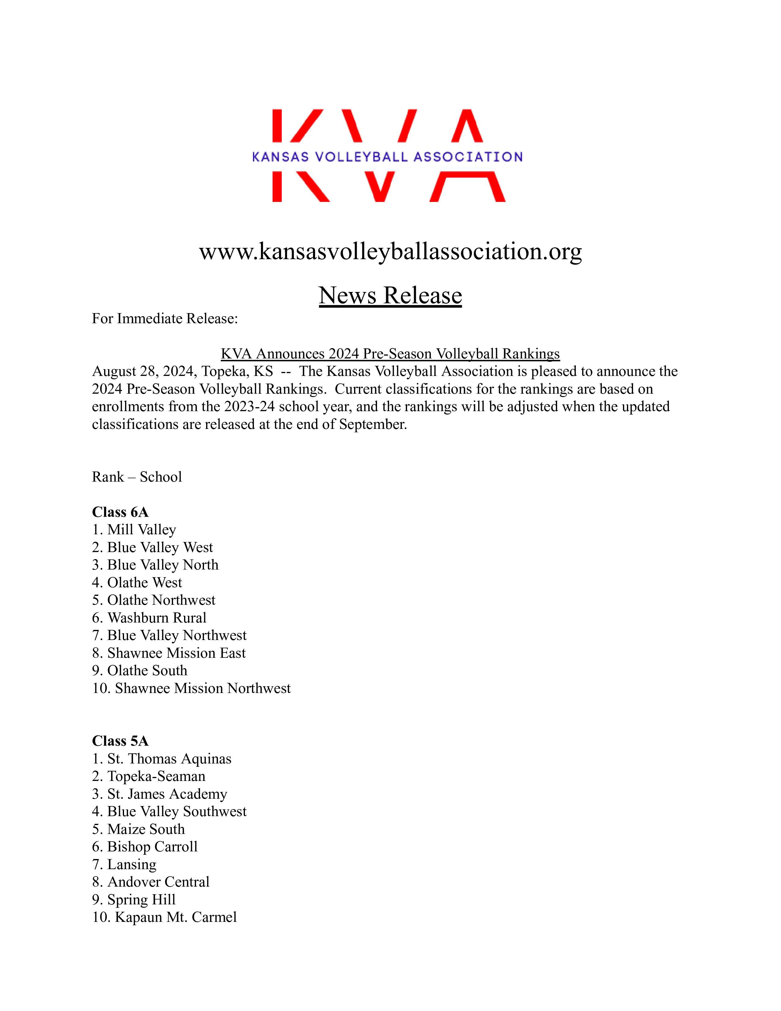 KVA 2024 preseason rankings KVA press release kansaspregame@gmail.com Posted in: Rankings Tags: Volleyball