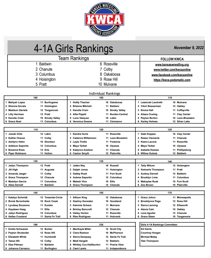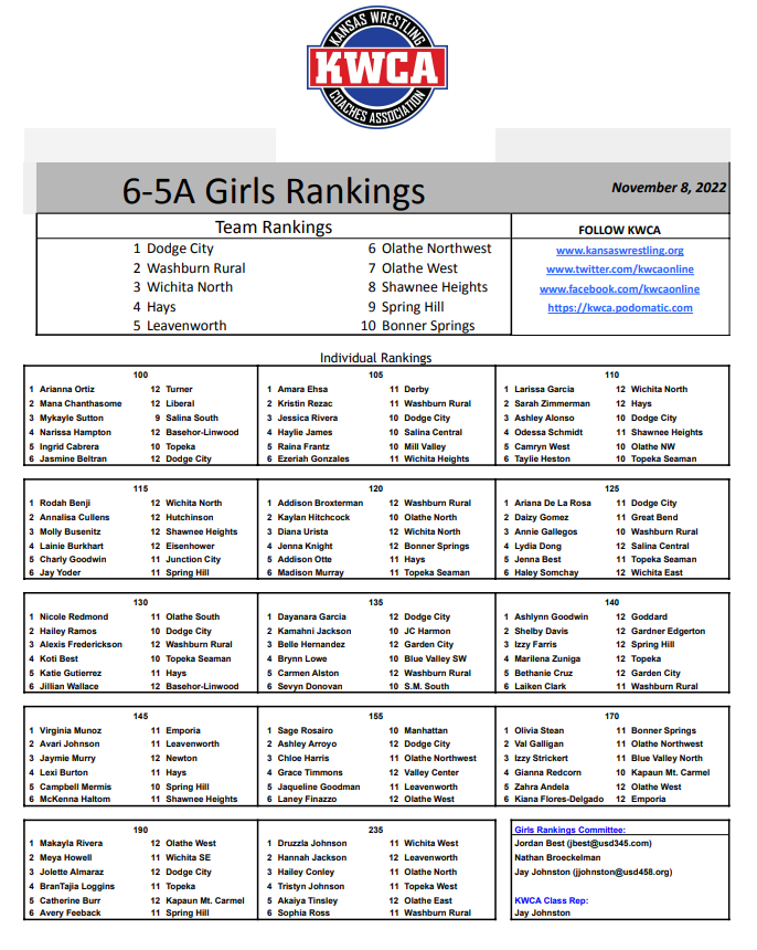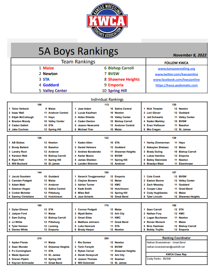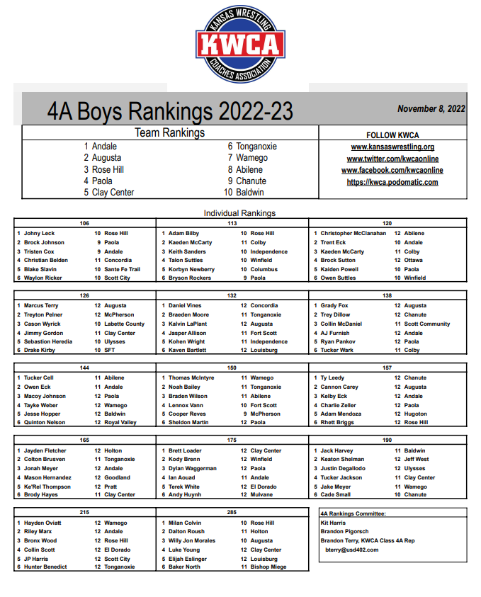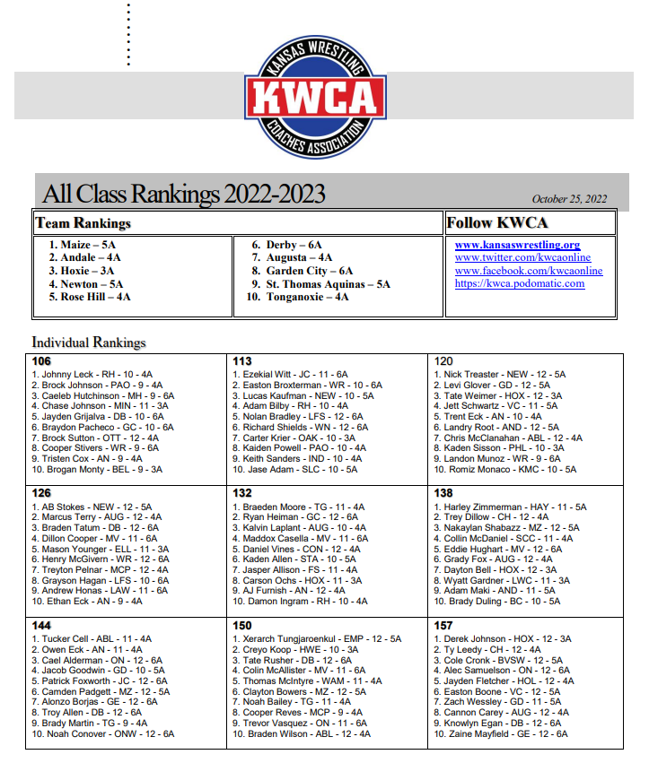 KWCA Preseason Rankings Posted in: FeaturesRankings On November 8th the Kansas Wrestling Coaches Assocation announced individual and team rankings for the upcoming boys and girls wrestling season Tags: Wrestling