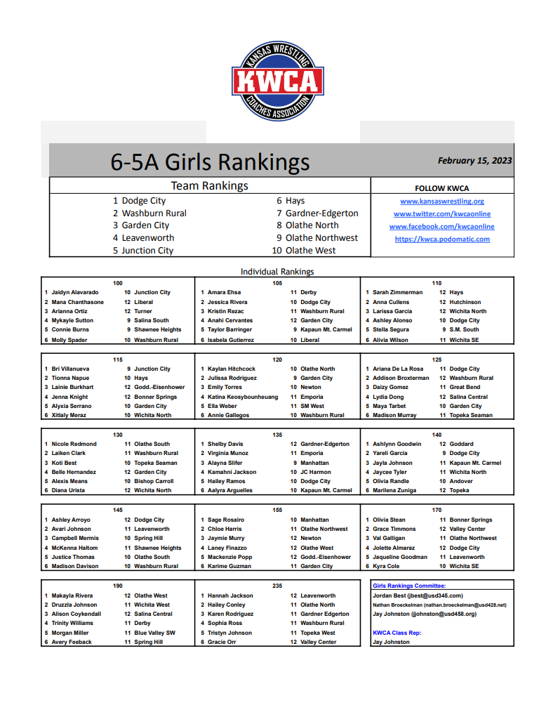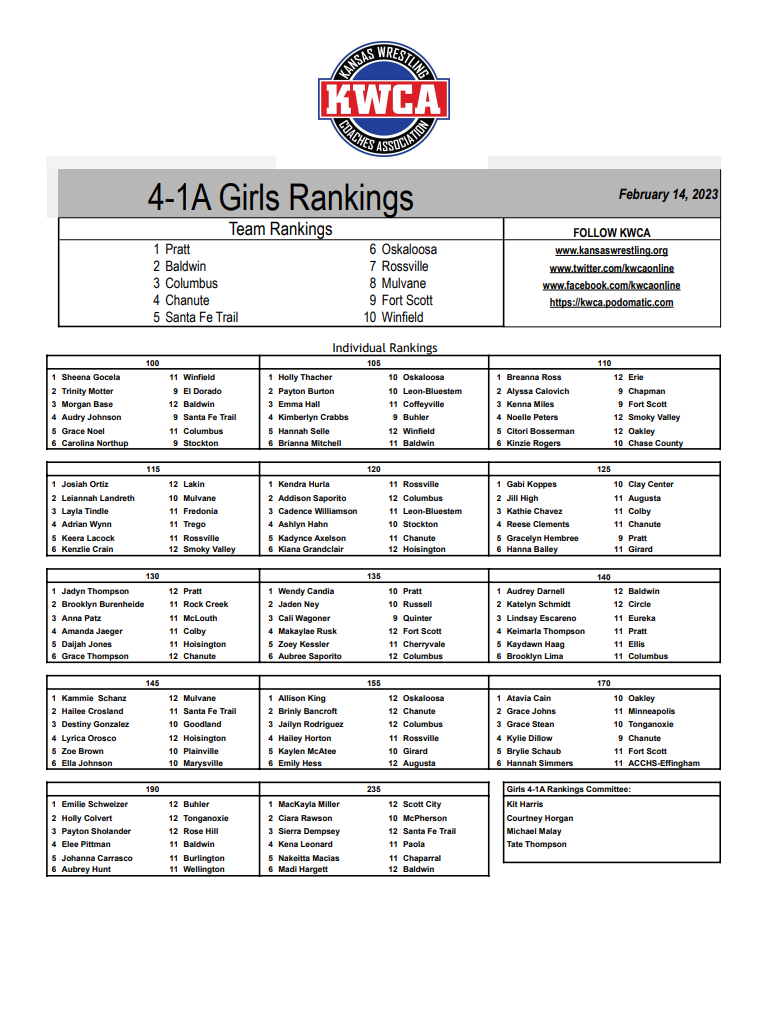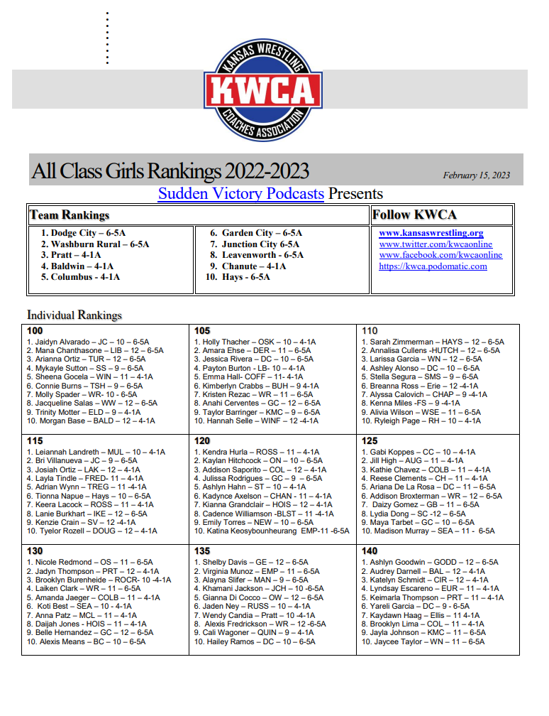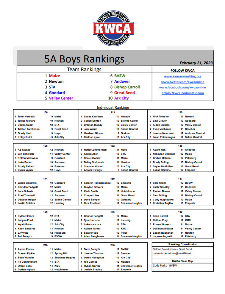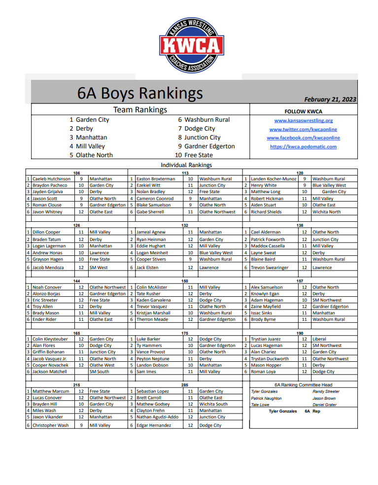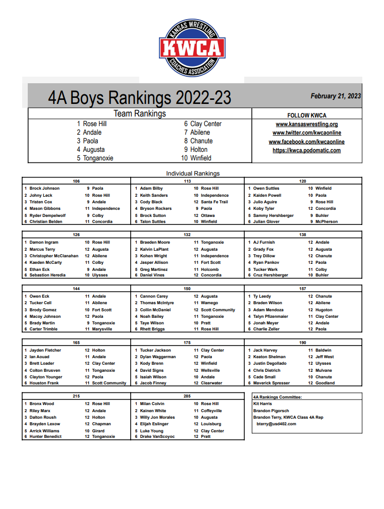 On February 21st the Kansas Wrestling Coaches Assocation announced their final regular season individual and team rankings