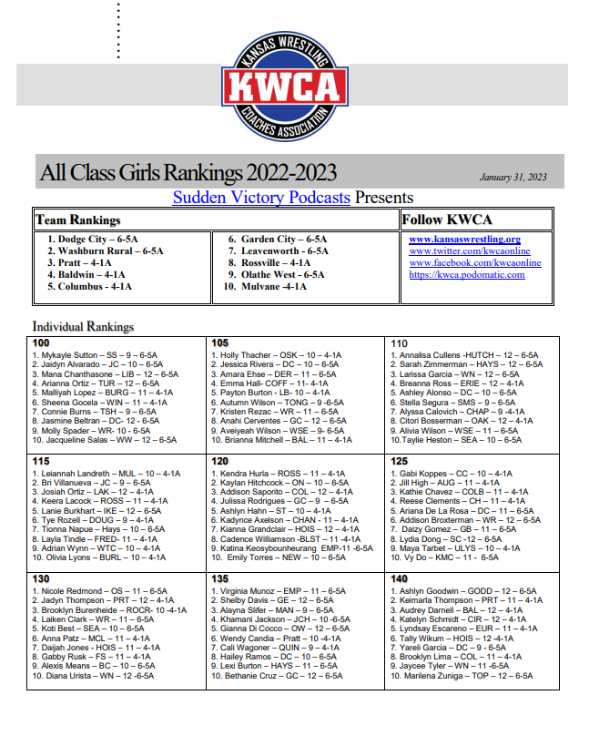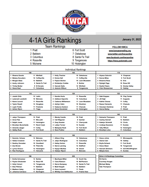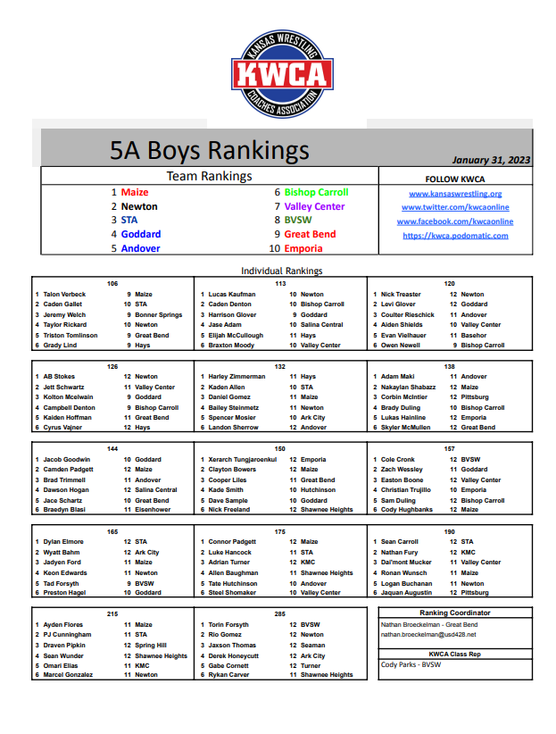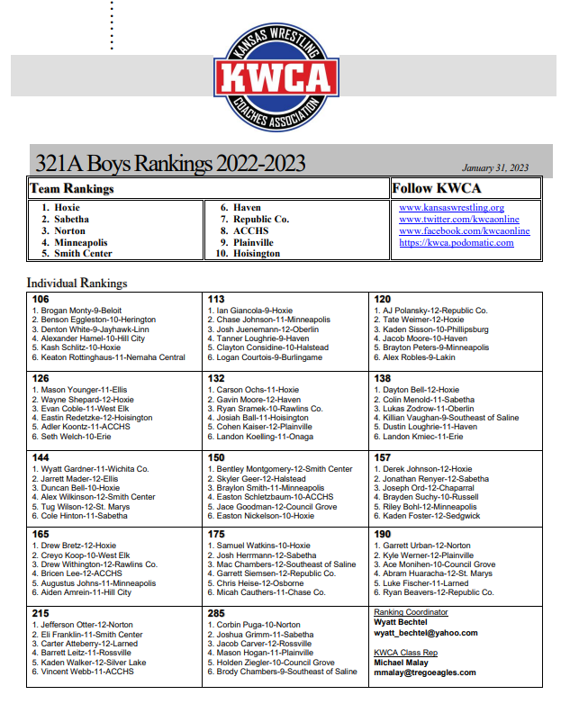 On January 31st the Kansas Wrestling Coaches Assocation announced their seventh regular season individual and team rankings