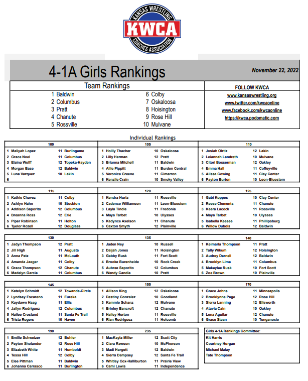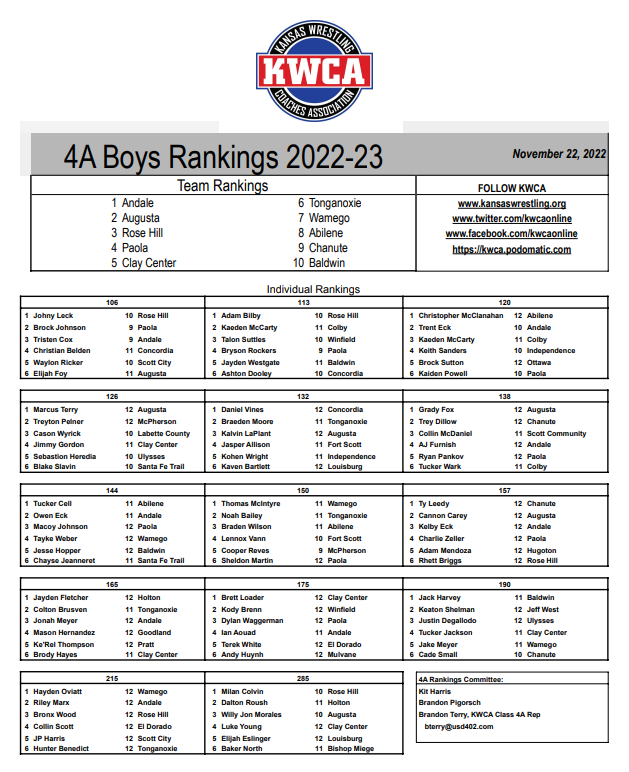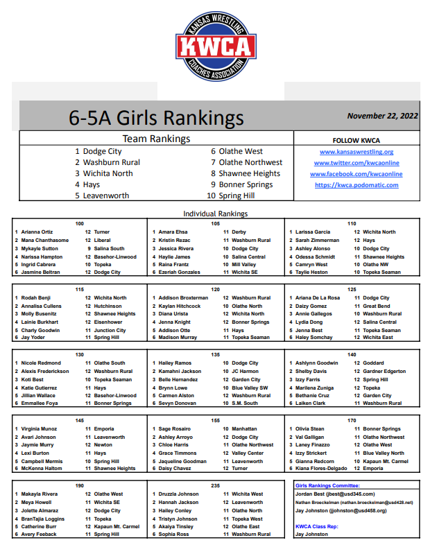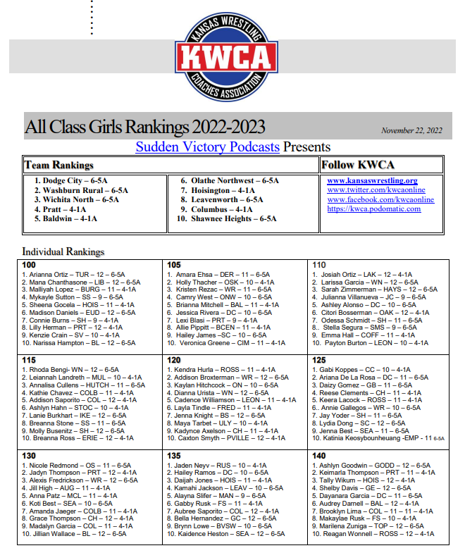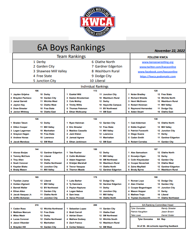 On November 22nd the Kansas Wrestling Coaches Assocation announced individual and team rankings for the upcoming boys and girls wrestling season, in light of initial weigh-ins