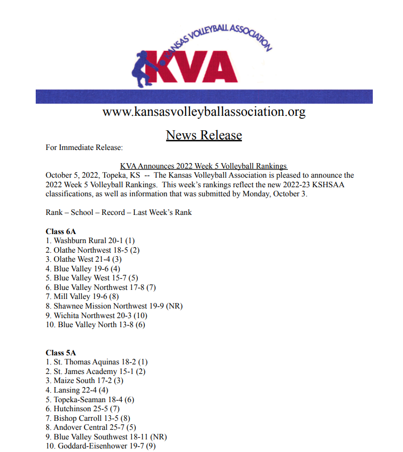 October 5th KVA rankings Posted in: FeaturesRankings The Kansas Volleyball Association shared their weekly rankings on Thursday Smith Center has just two losses on the season. (Photo: Julie Kuhlmann) Tags: Volleyball