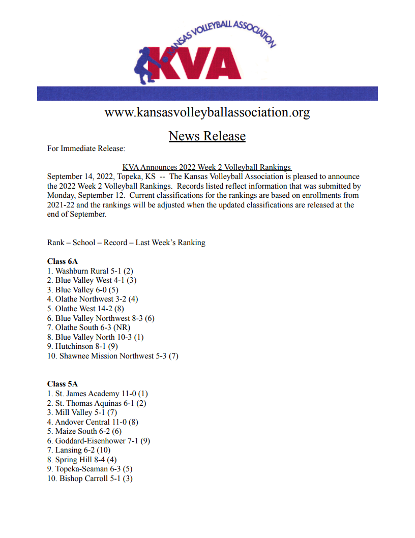 The Kansas Volleyball Association shared their weekly rankings Thursday morning