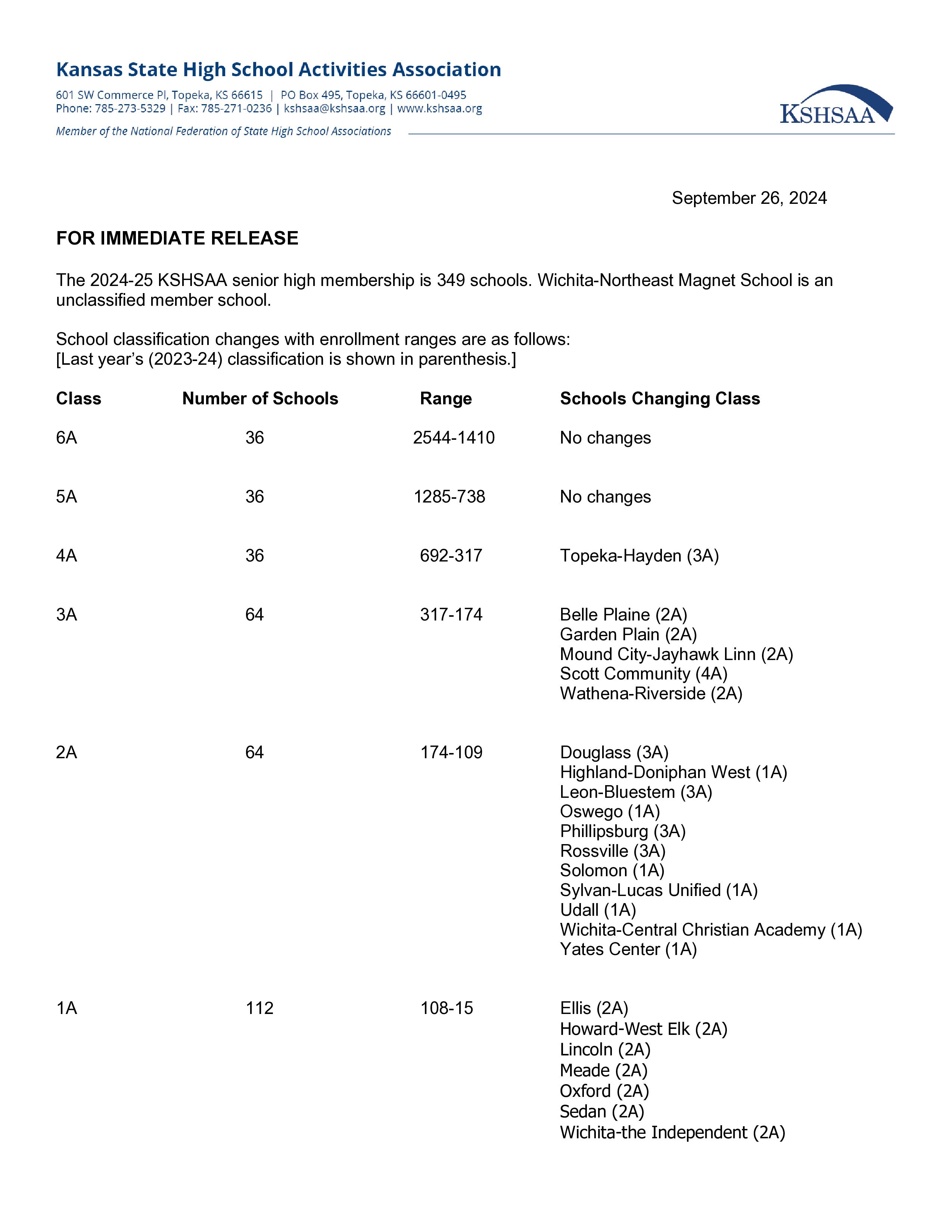 Read moreThe Kansas State High School Activities Association has announced the 2024 postseason host sites for volleyball and cross country. Find them at the links below. To switch classifications click on the tabs at the top right of each page.