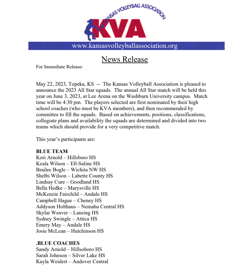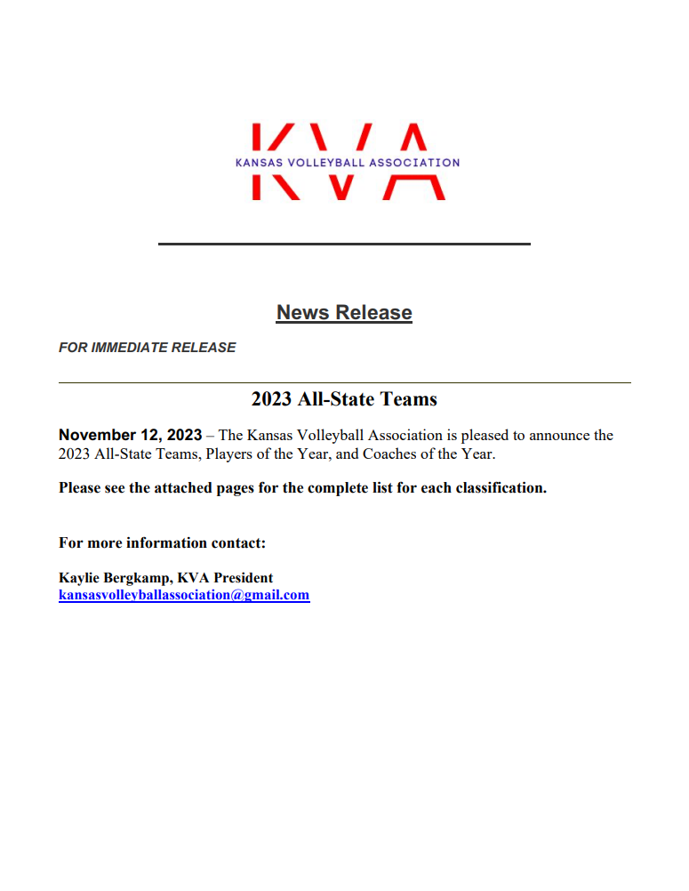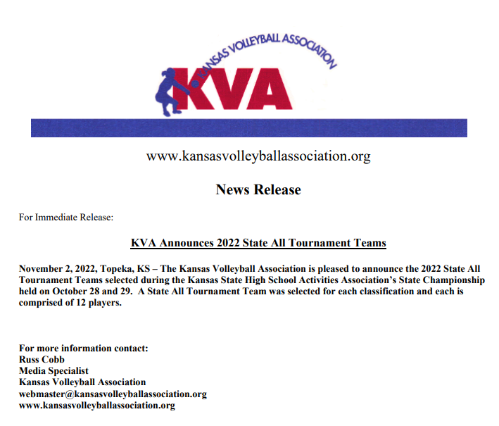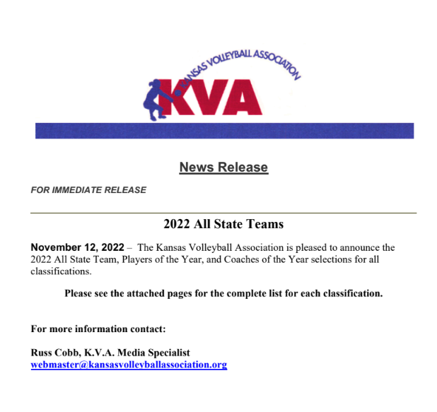 The Kansas Volleyball Association is pleased to announce the 2025 State All Tournament Teams selected during the Kansas State High School Activities Association’s State Championship held on October 30 through November 1.