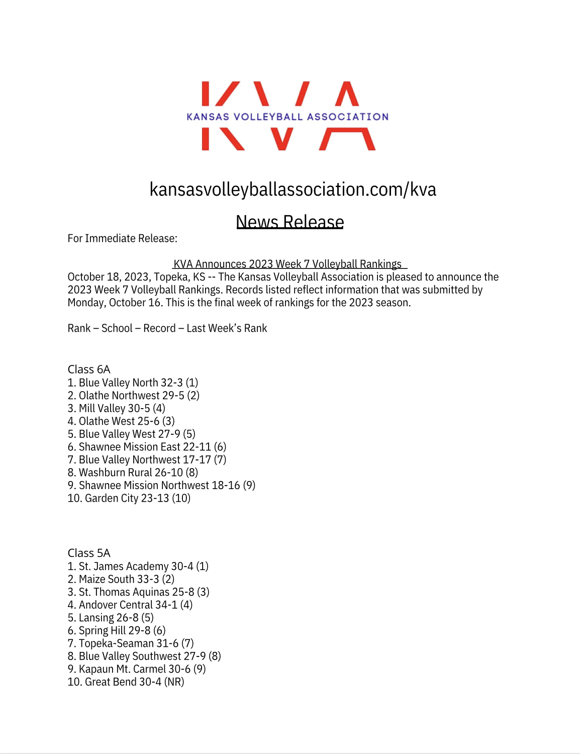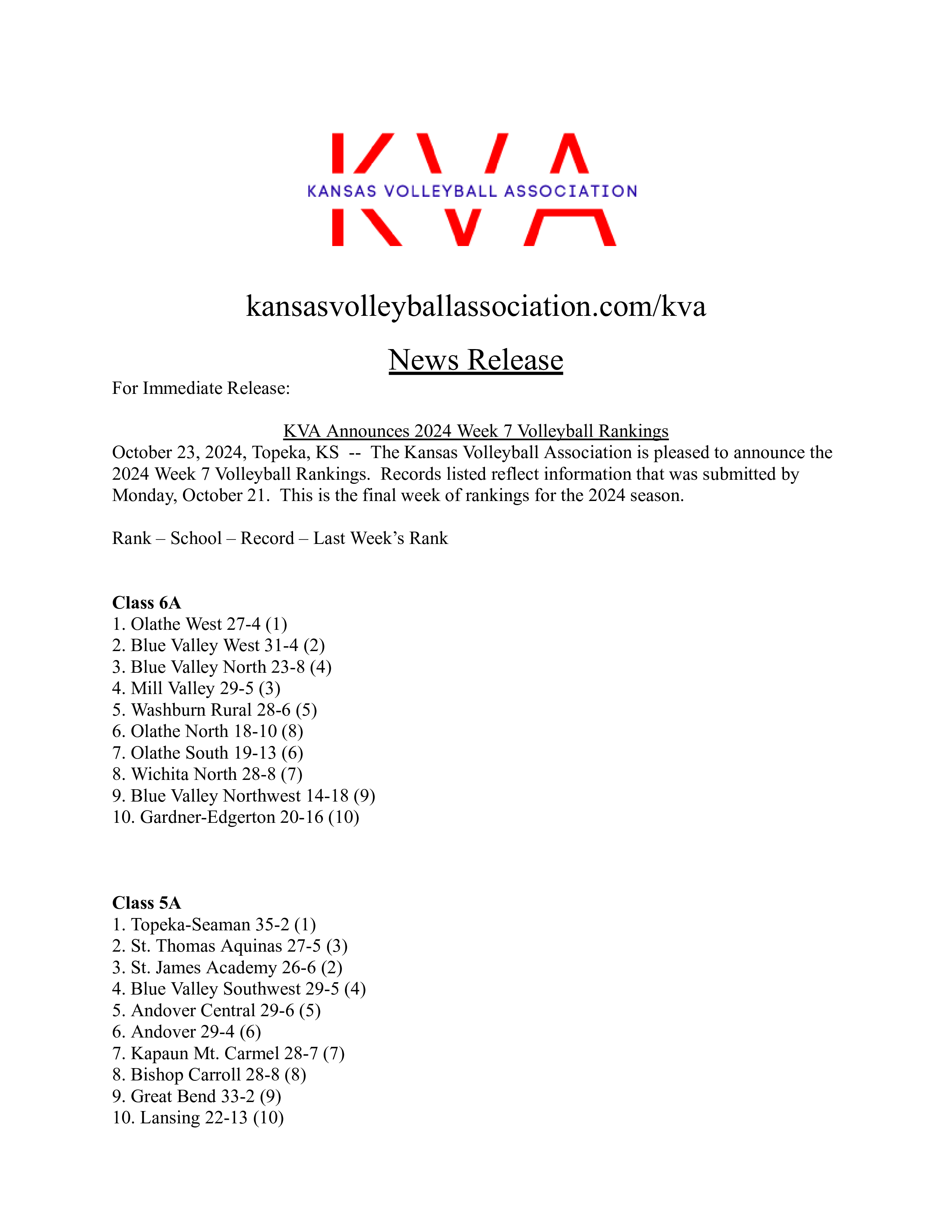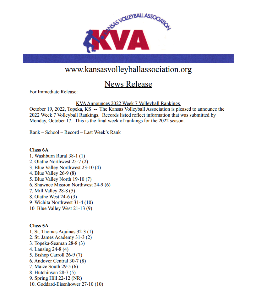 Read moreThe Kansas Volleyball Association is pleased to announce the 2025 Week 7 Volleyball Rankings. Records listed reflect information that was submitted by Monday, October 20. This is the final week of rankings for the 2025 season.