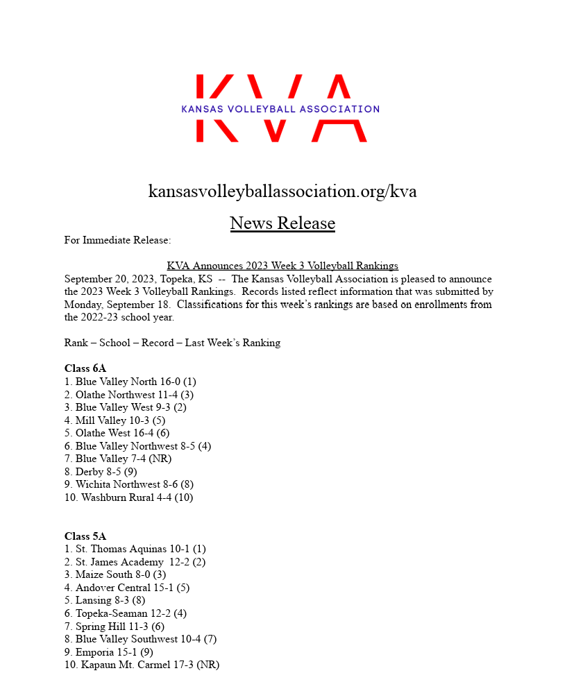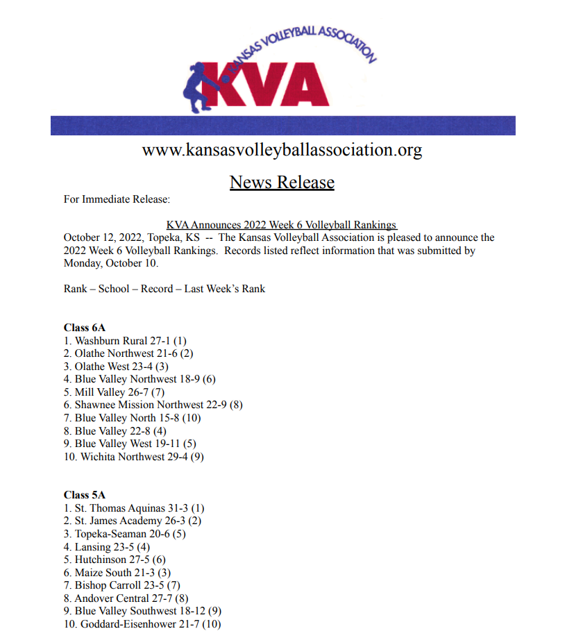 Read moreThe Kansas Volleyball Association is pleased to announce the 2025 Week 6 Volleyball Rankings. Records listed reflect information that was submitted by Monday, October 13.