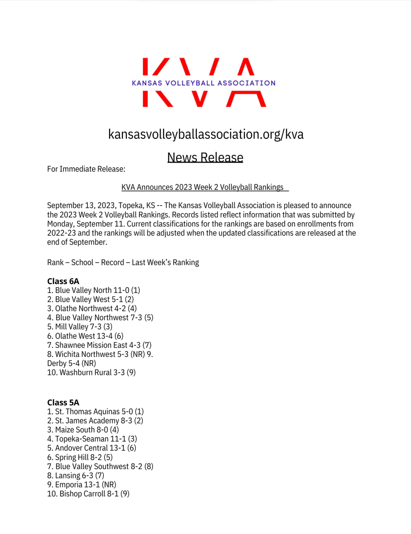 Read moreThe Kansas Volleyball Association released their second regular season rankings of 2025